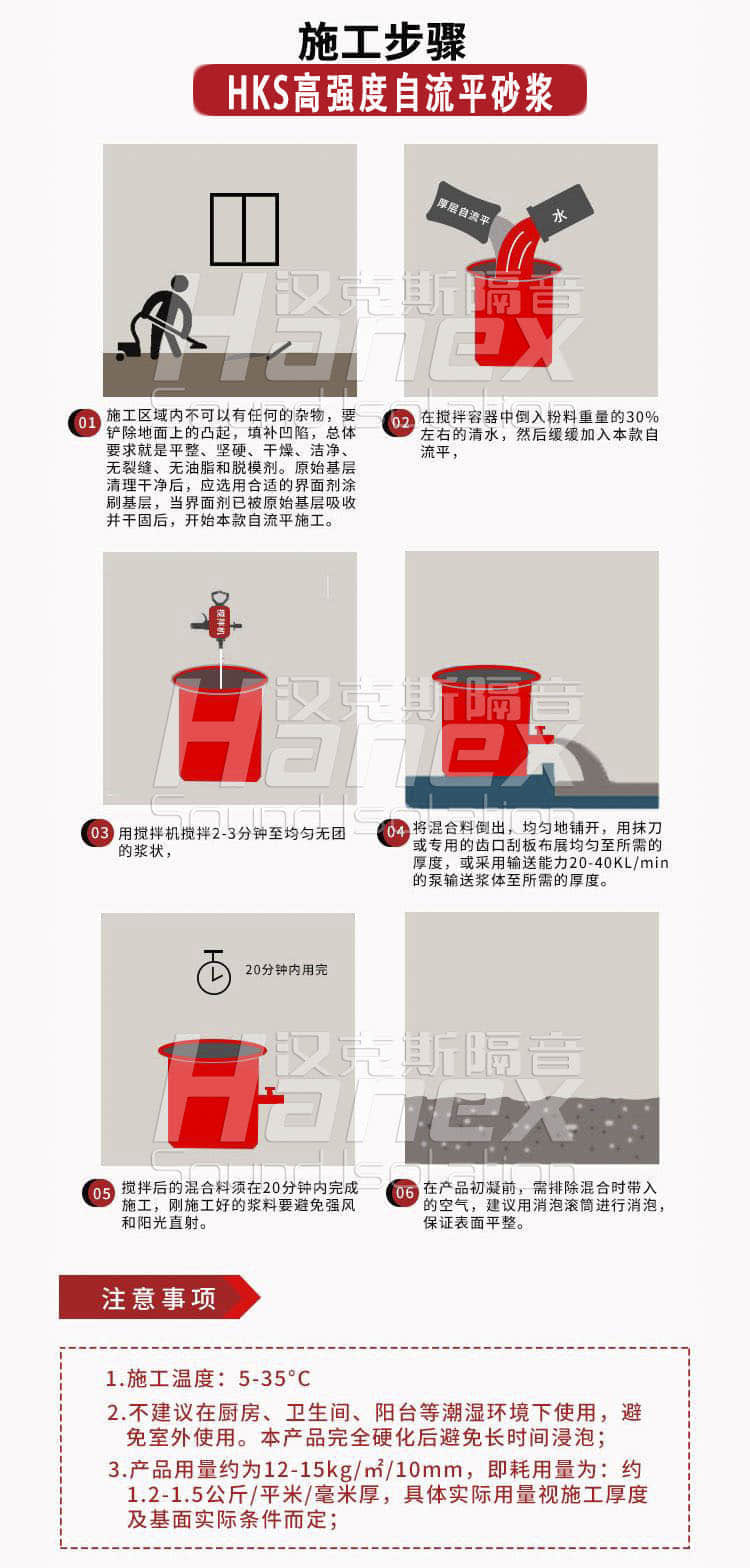 1.自流平砂漿加水量為35+2%,無需添加其他任何成份,先將水放入攪拌桶,再倒入自流平砂漿,用電動攪拌器攪拌2-5分鐘,應充分攪拌均勻
